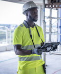 Polycotton piqué fabric with cotton on the inner side for enhanced comfort against the skin. Lightweight and breathable. Certified to EN ISO 20471:2013 A1:2016 Class 2. Orange colourway also certified to RIS-3279-TOM. Fabric provides UPF 40 protection. Heat-applied segmented tape for additional comfort. Contrast tipping to ribbed collar and cuff. Two-button placket. Side vent detail. Contains recycled polyester.